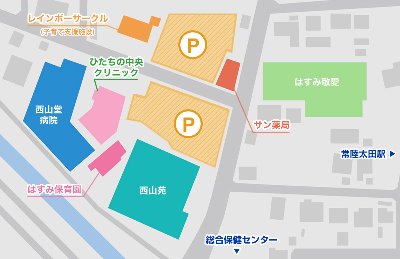 周囲には関連施設として、介護老人保健施設「はすみ敬愛」、外来専門診療所の「ひたちの中央クリニック」、特別養護老人ホーム「西山苑」と医療及び福祉のトータルケアシステムでご利用者に対応できる最適な環境を整えております。